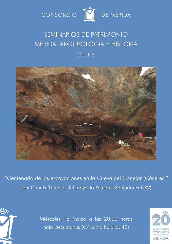 15 marzo 2016. El director del proyecto Primeros Pobladores-URV, Toni Canals, presentará en Mérida las últimas novedades derivadas de las intervenciones realizadas en los últimos años en la Cueva de El Conejar, ubicada en Cáceres. La conferencia, titulada 'Centenario de las excavaciones en la Cueva del Conejar' se celebra mañana, día 16, a las 20 horas en la Sala Decvmanus.