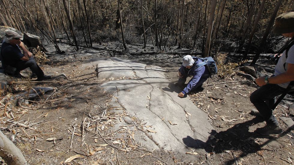 El fuego causó el pasado verano daños irreparables en varias estaciones de arte rupestre del monte San Miguel y en el valle de la Portela de Villestro (Santiago). Sin embargo, también ha facilitado la localización de otras. Miembros del colectivo A Rula, un grupo que se dedica a investigar sobre estas manifestaciones artísticas, halló más petroglifos en el área. Hasta ahora permanecían ocultos bajo los tojos.